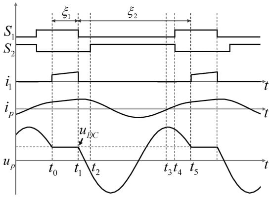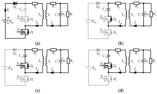 The operation modes of the proposed system in CCM are shown in Figure 2. On Figure 2, up, ip, is and uo are the state variables on Cp, Lp, Ls and Cs, respectively. And i1 is the current across the diode D0. The power injection process only includes Mode 1, shown in Figure 2a. The self-resonance process consists of Mode 2, Mode 3 and Mode 4, which are shown in Figure 2b–d, respectively. Since the performance on the primary side matters the stability of converter directly, only the operation curves of ip and up are shown in Figure 3. The operation time of power injection process and self-resonance process are ξ1 and ξ2, respectively.