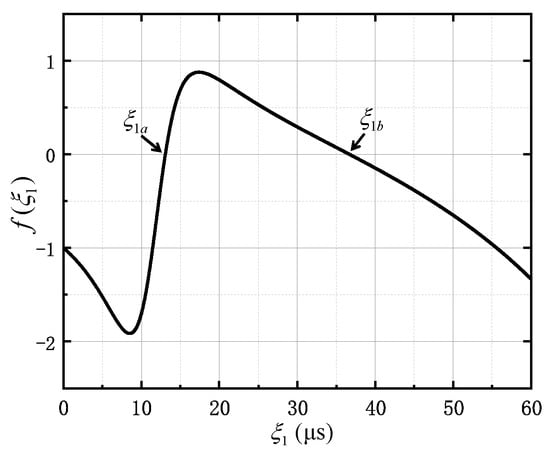 The curves of the function f (ξ1) with T = 100 μs are shown in Figure 6. There are two results of f (ξ1) = 0, that is, ξ1a = 13.09 μs and ξ1b = 36.71 μs. Then, bring ξ1a and ξ1b into (10) to solve the corresponding fixed point, respectively, and the results are shown in Table 3.