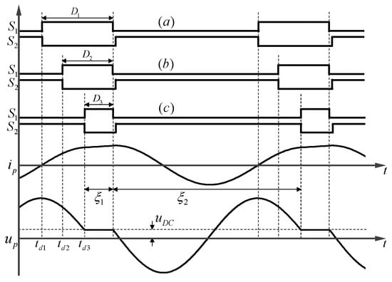 Based on the analysis above, once up > Edc and ip > 0 are both satisfied at the moment of turning-on S1 while turning-off S2, the boundary β1 will meet and the operation point will be self-determined by the system. In Figure 8a, the maximum duty of S1 has been taken at the critical position of ip = 0. In Figure 8c, the minimum duty of S1 has been taken at the boundary position of up = Edc. Hence, once the duty of S1 takes any values in the margin [D3, D1], the operation points of the double-switch IPIFR-WPT system will be self-determined to be the same and the waveforms of up(t) and ip(t) are also the same. And the margin [D3, D1] is called the soft-switching margin.
