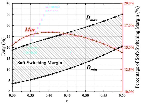 When k changes from 0.3 to 0.6, the curves of soft-switching margin [Dmin, Dmax] can be plotted as Figure 9 and Mar is defined as the percentage of this margin in cycle T as follows:
