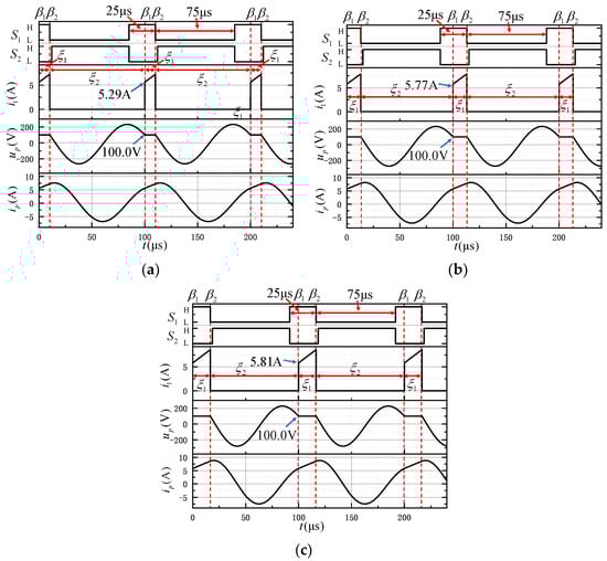 Then, as shown in Figure 10, the waveforms of i1(t), ip(t) and up(t) are plotted when k equals to (a) 0.45, (b) 0.50 and (c) 0.55, respectively. The determined intervals ξ1 by the system itself are (a) 10.09 μs, (b) 13.09 μs and (c) 16.55 μs correspondingly and the boundary conditions β1 are all meeting in the three figures. Therefore, when the switching strategies remain the same and the coupling coefficient k changes dynamically, the IPIFR-WPT system can keep working in soft-switching states by self-determining its operating point.