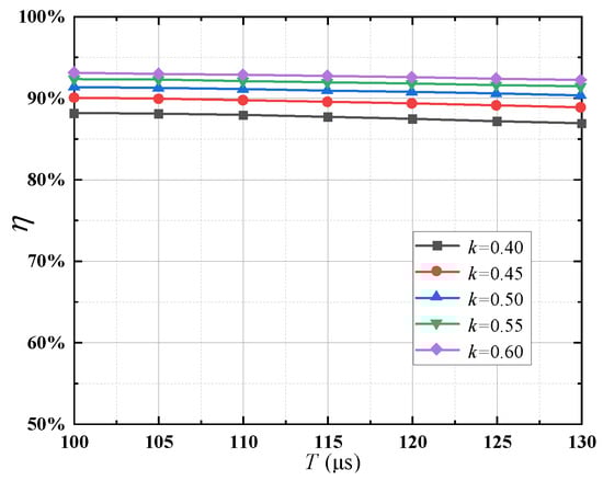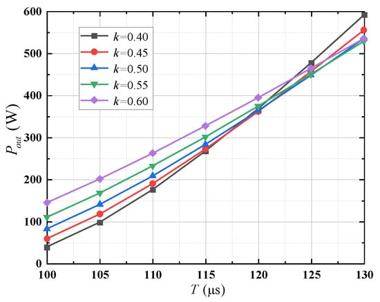 In Figure 11, there is a monotonic relationship between the output power Pout and cycle T and the linear relationship between Pout and T becomes more obvious when the coupling coefficients k increase. Hence, it is simple to control the output power by adjusting the cycle T, namely, the frequency f of the IPIFR-WPT system.