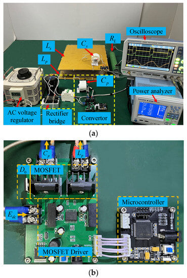 Based on the main circuit of the double-switch IPIFR-WPT system, the experimental system has been built as shown in Figure 13a. The part of the DC voltage source consists of the AC voltage regulator and rectifier module (MDQ100A1600V). As shown in Figure 13b, the convertor is composed of the MOSFET driver (SI8233), the MOSFET (C2M0045120D), the diode D0 (MURF2060) and the microcontroller (STM32F107VC). The values of Lp, Cp, Ls, Cs and RL are selected as Table 2. And the oscilloscope and power analyzer are RTB2004 (Ronde & Schwarz, Munich, Germany) and WT500 (Yokogawa, Musashino, Japan), respectively.