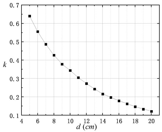 The relationship between the coupling coefficient k and the distance d of the coils are shown in Figure 14. With the increases of the distance d from 5 cm to 20 cm, the coupling coefficient k decreases from 0.64 to 0.12. Notice, in the follow-up experiments, the coupling coefficient k is always changed via changing the distance of the coils.