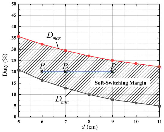 The curves of soft-switching margins with respect to the relative distance d of coils is shown in Figure 15. Notice, at the operation points P1, P2 and P3, the distances of the coils are 6 cm, 7 cm and 9 cm, respectively, but the duty of S1 is the same, 20%. And the waveforms working at P1, P2 and P3 are shown in Figure 16.