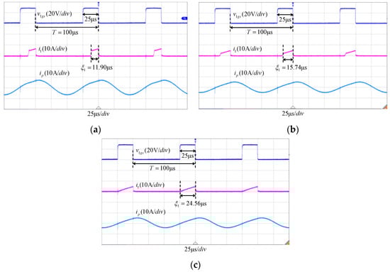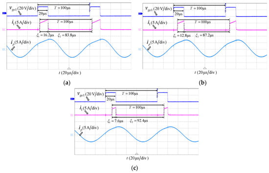 When d equals to (a) 6 cm, (b) 7 cm and (c) 9 cm, respectively, the corresponding waveforms of vgs1(t), i1(t) and ip(t) are shown in Figure 16. The determined intervals ξ1 by the system itself are (a) 16.2 μs, (b) 12.8 μs and (c) 7.6 μs, respectively. Therefore, when the switching strategies remains the same and the relative distance d of coils changes dynamically, the IPIFR-WPT system can keep working in soft-switching states by self-determining its operating point, which operates the same as the theoretical results.