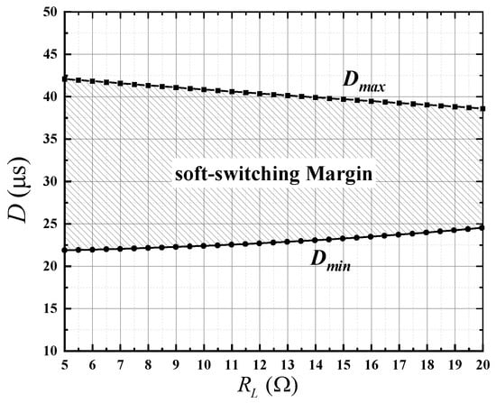 As shown in Figure 17, taking a fixed working cycle T = 100 μs, the curves of soft-switching margins with respect to the change in equivalent load resistance RL are plotted.
