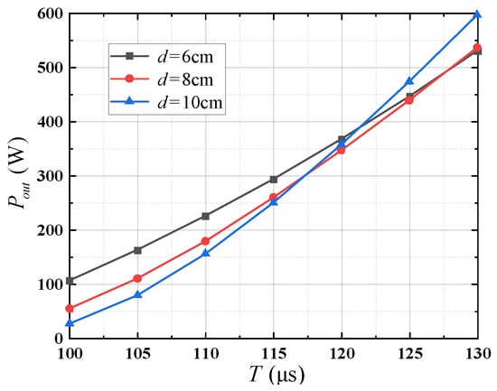 According to the analysis above, the output power shows monotonicity with respect to cycle T. The experimental curves are shown in Figure 19, when the distances d are (a) 6 cm, (b) 8 cm and (c) 10 cm, respectively, the output power increases from (a) 106 W, (b) 54 W, (c) 26 W to (a) 530 W, (b) 537 W, (c) 597 W monotonously with the rise of cycle T from 100 μs to 130 μs, which is pretty close to the calculated results in Figure 11.