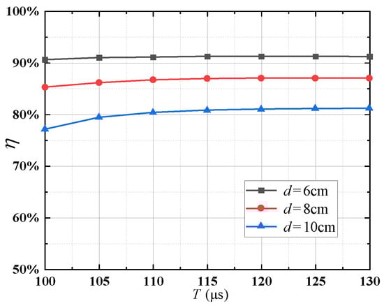As for the monotonicity of the power curve about cycle T, the output power rises from 106 W to 597 W with the increases of T from 100 μs to 130 μs at 10 cm coils distance meanwhile the efficiency almost maintains a constant (80%) and several curves with different coil distances present the monotonicity of output power about the cycle. Hence, the simple method for the IPIFR system to control the output power flexibly is adjusting the operation cycle under a constant coils distance d. Furthermore, if the coupling of the coils becomes stronger, the efficiency of the IPIFR system will rise. Concretely, when the coils distance changes from 10 cm to 6 cm, the average efficiency rises from 80% to 91%.