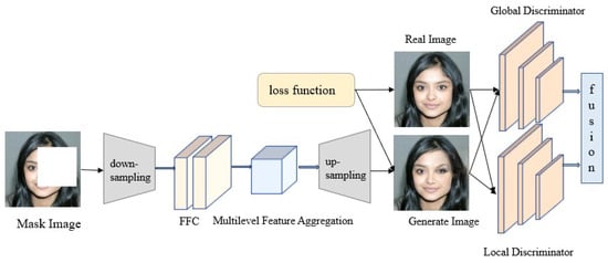 In the generation network, we input a mask image, first processing the mask image, and then using a lightweight multi-level feature aggregation network to extract suitable feature blocks for filling. At present, image inpainting tasks based on generative adversarial networks have achieved good results, but the restoration effect is still unsatisfactory for images with complex structures and high-definition pixels. For complex structured images, previous methods have not taken into account the semantic structure consistency of the results and expected targets, which can lead to a lack of clear semantic details in the restoration results. Therefore, we designed a multi-level feature aggregation module in the generation network to extract features from multiple levels, obtain multiple features, and recover more detailed information. For high-resolution images, we hope to retain very realistic and perfect details after processing, achieving high-quality repair results. Therefore, in the generation network, we designed and used a fast Fourier convolution (FFC) module to effectively solve the problem of poor generalization performance of the network model for high-resolution images.