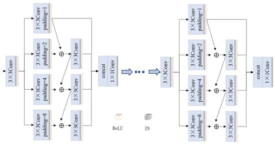 In the multi-level feature aggregation module designed in this study, conv-3 indicates that the convolution kernel is a 3 × 3 convolution, the first convolution layer is used to reduce the number of feature channels, and then features are extracted through four different branches using convolutions with different expansion rates: padding = 1 indicates that the expansion rate is 1, padding = 2 indicates that the expansion rate is 2, padding = 4 indicates that the expansion rate is 4, and padding = 8 indicates an expansion rate of 8. Each cavity convolution is followed by connecting the ReLU activation layer and the instance normalization layer (IN), ⊕ summing the elements. Finally, the features of the four branches are aggregated together, and the number of feature channels is expanded to 256 by fusing the aggregated features through a single 1 × 1 convolution, with the last convolution followed by connecting only the instance normalization layer without using the activation function.