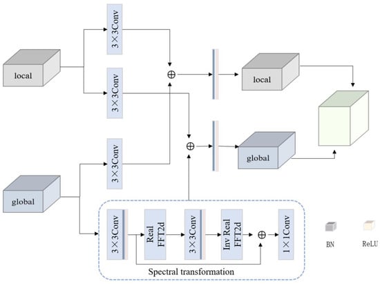 We designed and used a new convolution module, fast Fourier convolution (FFC), in the generative network, which not only has a non-local receptive field but also achieves the fusion of cross-scale information inside the convolution, making the model consider the global contextual information in the early layers, which is suitable for high-resolution images. The structure of FFC is shown in Figure 6.