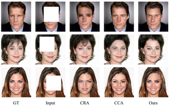 In the same experimental setting, we compared the method of this paper with several classical, state-of-the-art methods to demonstrate the superiority of the method of this paper. These models were trained using the same experimental setup until convergence. These models include CRA [], RFR [], CCA [], and PGAN []. Comparison experiments of this study were performed on CelebA_HQ [] and mural datasets, and qualitative and quantitative results were measured to compare our model with previous methods. The inpainting results for rectangular masks are shown in Figure 7, and the inpainting results for irregular masks are shown in Figure 8.