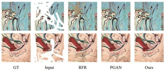 The purpose of image inpainting is to recover the missing information based on the known information of the image and fill in the missing pixels of the image in order to achieve the overall semantic structure consistency and visual realism [,]. This task has attracted considerable of attention over the years, and restorers tend to use the most appropriate way to restore images to their original state while ensuring the most desirable artistic effect [,]. High-quality image inpainting has a wide range of application areas, such as target removal, scratch removal, watermark removal, and inpainting of old photos [,,,].