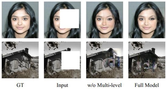 In order to verify the performance effect of this paper’s multi-level feature aggregation module in the image inpainting task, we carried out experiments using the multi-level feature aggregation module and a single level of ordinary convolution. The experimental results are shown in Figure 9, and the results of the evaluation indexes are shown in Table 3. When the multi-level feature aggregation module is not used, the restored results have more obvious artifacts and unreasonable structures, and the multi-level feature aggregation module can extract features from convolutions with different expansion rates, which makes the network obtain more feature information and thus helps to restore a more reasonable structure for the missing part. For the CelebA_HQ dataset, after using the multi-level feature aggregation module, the PSNR and SSIM are improved by 1.92 dB and 0.144, respectively, and for the Places2 dataset, after using the multi-level feature aggregation module, the PSNR and SSIM are improved by 1.19 dB and 0.061, respectively.