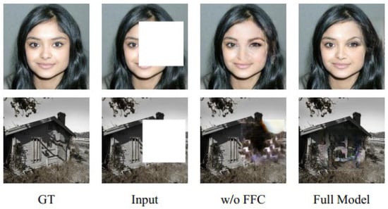 In order to verify the performance effect of using FFC in the image inpainting task in this paper, we conducted experiments with and without FFC. The experimental results are shown in Figure 10, and the results of evaluation indexes are shown in Table 4. When FFC is not used, the contour edges of the face inpainting are not smooth enough, and the natural landscape leaves are partially missing. FFC takes the global context into account and not only has a non-local receptive field but also achieves the fusion of cross-scale information inside the convolution, which makes the model consider the global context information in the early layers and can help the model to show excellent results for high-resolution images. For the CelebA_HQ dataset, the PSNR and SSIM were improved by 0.62 dB and 0.050, respectively, after using FFC. For the Places2 dataset, the PSNR and SSIM were improved by 1.94 dB and 0.025, respectively, after using FFC.