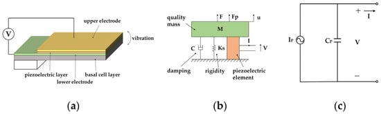 Theoretical model. (a) Traditional piezoelectric cantilever structure. (b) Equivalent model of piezoelectric energy harvesting. (c) Equivalent circuit model of the piezoelectric element.