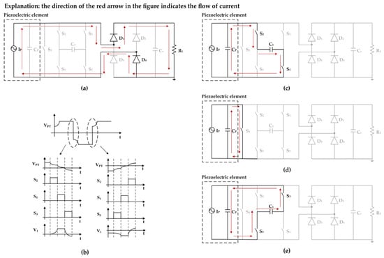 The working principle is as follows: in the whole working process, all switches are in the off state most of the time. Figure 3a shows the operation of the circuit before the voltage flips from positive to negative, and the output of the piezoelectric element powers the load through the rectifier bridge. When the vibration displacement of the piezoelectric element reaches the maximum value, as shown in Figure 3c, the current is about to pass zero–point from the positive to negative, and the switch S2 is closed so that the capacitor charges . Charging is completed until the voltages of the two capacitors are equal. At this time, the first phase of the voltage flip is completed, and the switch S2 is disconnected. Therefore, the voltage across and is
