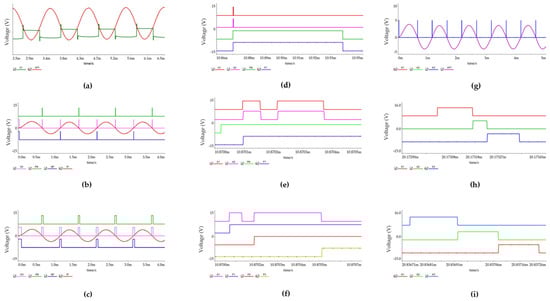 Waveform of simulation. (a) Comparison the waveform of V1 and VPT; (b) Waveform of double–crossing detection circuit when V2 and V3 are ±0.05 V; (c) Waveform of double–crossing detection circuit when V2 and V3 are ±0.5 V; (d) The generation process of P1 signal global graph; (e) The generation process of P1 signal local graph; (f) Signal generation process of P1, P2 and P3. (g) The generation process of switching signals K1, K2, and K3 global graph; (h) The generation process of switching signals K1, K2, and K3 from positive to negative; (i) The generation process of switching signals K1, K2, and K3 from negative to positive.