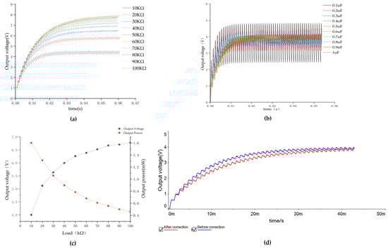 The observation depicted in Figure 8a reveals a positive correlation between the load and the output voltage, with the rate of increase gradually diminishing. Additionally, Figure 8b demonstrates that higher Cr values enhance the stability of the output voltage, albeit at the cost of increased response time. Stability is mainly characterized by the fluctuation of the voltage value within a certain range, the smaller the range the better the stability. Response time is mainly the time it takes for the voltage value to reach a stabilized value. Due to the circuit’s application in a fuse, it becomes imperative to ascertain the value of Cr. In this study, a value of 1 μF has been chosen. As depicted in Figure 8c, it is evident that the load’s output voltage and output power exhibit an inverse relationship as the load intensifies, eventually reaching a state of gradual stabilization. Based on the data presented in Figure 8d, when the current source is 5 mA and the load is 10 kΩ, the voltage at both ends of the load remains constant at 3.75 V in the absence of the power factor correction circuit. Furthermore, the output power is measured to be 1.41 mW. Conversely, when the power factor correction circuit is employed, the voltage across the load stabilizes at 4 V, resulting in an output power of 1.6 mW. Consequently, it can be deduced that the implementation of the power factor correction circuit leads to a relative increase in output power of 13.5%.