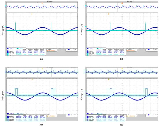 Figure 10 is the experimental waveform of the double–limit zero–crossing detection circuit. Figure 10a,d are PN, indicating that IP is zero–crossing from positive to negative, and Figure 10b,d are NP, indicating that IP is zero–crossing from negative to positive. By adjusting the size of the two reference voltages, the width of the zero–crossing signal can be changed to achieve a double–limit function.