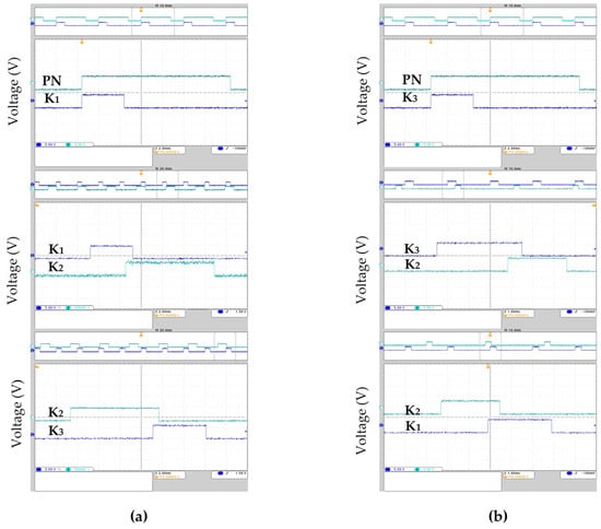 Figure 11a shows the on–off of switches K1, K2, and K3 when the voltage VPT flips from positive to negative. Since the oscilloscope used in the experiment shows at most two channel waveforms at the same time, the following figures compare the waveforms of PN and K1, K1, and K2, and K2 and K3, respectively. It can be seen that the timing of the switch closure is K1–K2–K3, which is consistent with the simulation data. Figure 11b is the on–off condition of the switch K1, K2, and K3 when the voltage VPT flips from negative to positive. It can be inferred that the pulse generation circuit accelerates the voltage flip by controlling the on–off of the switch.