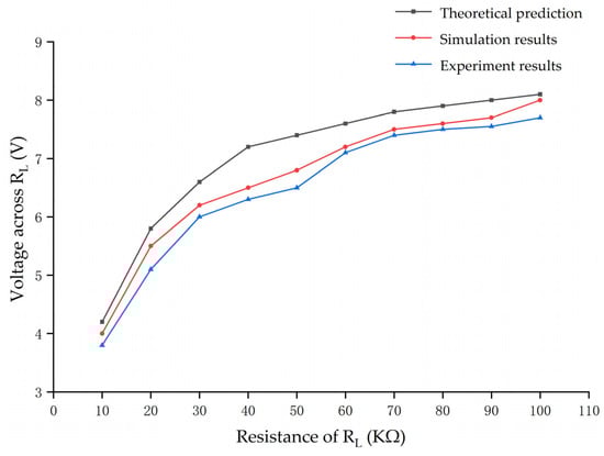 Figure 12 provides the curve of the theoretical prediction, simulation results, and experimental results of the output voltage variation with the load RL, which shows that although there is a certain gap between the simulation results and the experimental results compared to the theoretical prediction, the variation trend is the same and in line with the expectation.