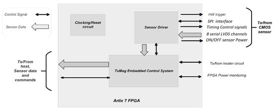 The rest of the paper is organized as follows: Section 2, Materials and Methods, describes the general FPGA block architecture of the TuMag camera. This section details the TuMag-ECS architecture and its main hardware blocks and functionalities, as well as the embedded software that controls the communications between the camera–host and the test bench software application to set up laboratory experiments. Finally, Section 3 presents the results and conclusions.