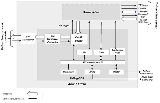 The TuMag-ECS was implemented with the Vivado tool (Figure 2); in the Supplementary Material, we added a PDF file with the block diagram of all TuMag-ECS circuits. The main task of this system is to control both the GSENSE400BSI sensor driver (right side) and the CoaXPress communication interface with the host or frame grabber (left side). In addition, it also controls/monitors other modules (IP) necessary for the instrument, such as the heater module (temperature controller), the SPI module to read the internal sensor registers, the train module to put the sensor in training mode, the AXI_to Camera register necessary to configure the sensor, the XADC module to monitor internal FPGA parameters, and, finally, the Easii_cxp_dev controller of the CoaXPress communication interface.