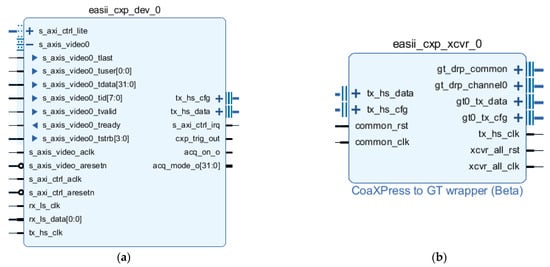 Block diagram of the embedded CxP control interface. (a) CoaXPress IP controller; (b) wrapper interface to the GTP FPGA transceiver.