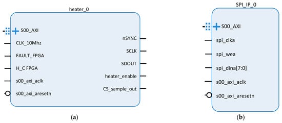 (a) Block diagram of the interface of the heater module. (b) Block diagram of the interface of the SPI module.