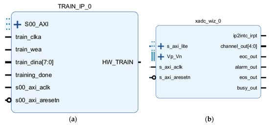 In the write operation, the FSM takes the data from the RB2 register and reprograms the internal register of the sensor. In the read operation, FSM reads the data from the sensor (organized as 32 8-bit registers) and stores it in the SPI module. The architecture of this IP is based on a dual real port BlockRam. It is wrapped with an AXI4-Lite interface on the MicroBlaze side and an 8 data bit on the SPI sensor side (Table 5). In this way, the memory decouples the clock domain of the sensor driver from the clock domain of the AXI4-Lite interface. Figure 4b shows the IP interface.
