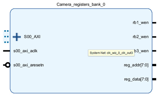 The embedded software application configures and controls the operation of the CMOS through the AXI_to_Camera register module (Figure 6). To do this, the module has three register memory banks, RB1, RB2, and RB3, for storing the configuration parameters of the sensor driver. The RB1 register bank is used to control the data acquisition process, set the sensor in calibration, acquisition, or test mode, store the calibration words, and store the words for testing the sensor in test mode. The RB2 register bank stores the 256 bits sensor register for configuration through the FSM circuit integrated in the sensor driver module. RB3 is a register bank used by the image decoder module (in the sensor driver block) to generate the timing control signal for image acquisition. Table 8 shows the interface ports description of the camera register banks module.