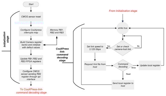 Figure 7 depicts a simplified flow diagram of the main code. We can differentiate two stages: the initialization stage (Figure 7 to the left) and the CoaXPress link-command decoding stage (Figure 7 to the right).
