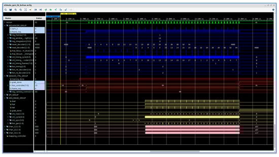 This signal is used to start or enable an FSM that controls the sensor readout cycle. This cycle consists of three phases: resetting rows, waiting for the configured exposure time, and eventually reading out in row order [14]. Figure 8 depicts a VHDL hardware simulation of the acquisition process in the sensor driver of Figure 2, showing only 32 rows for the compressed view. After the HW trigger signal is received, the sensor driver module controls the acquisition process by generating the image request signal (frame_req set to high red signal in Figure 8) and generating the time signals to synchronize the data readout (blue signals in Figure 8). The sync_x signal sets the data reading rate on the GPIXEL sensor device and, when the fval signal is set to 1, controls the time period where the data are available to be transmitted to the host. After the last line, the lval signal is transmitted, the grab_done signal (red in Figure 8) is set to high, and the sensor driver control goes into an idle state, waiting for a new HW trigger or command from the host.