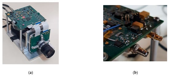 The data transfer from the CMOS sensor to the instrument host is performed via a CoaXPress interface. This interface connects devices (typically cameras) to a host (frame grabber) and allows, over the same cable (single coaxial cable), data transfers plus commands and power. The CoaXPress standard is a fast, point-to-point asymmetric speed (20.833 Mbit/s to uplink and up to 6 Gbit/s to downlink) 8B/10B encoded packet serial communication [12,13]. On each connection, the link protocol defines a set of logical channels, which are used to send trigger signals, general-purpose inputs and outputs, control data, and high-speed streaming video transmission. Each device connected to the interface is controlled through the control channel by the host.