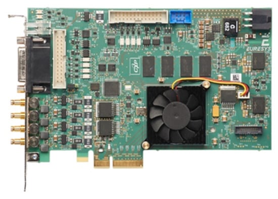 Photograph of a CoaXPress frame grabber used for the test-bench software application.