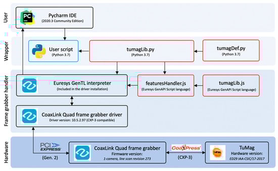 Euresys Company provides its own GenAPI script language (like JavaScript) for programming modules and scripts to handle the features of frame grabbers and cameras based on GenICam. To adapt this generic software architecture to the TuMag camera, we implemented the tumagLib.js and the featuresHandler.js scripts. The first file defines a set of functions implemented to read, write, and execute the TuMag features. The second file contains the program used to handle the instrument. Figure 11 shows a block diagram representing the hardware and software architecture of TBSA used to handle the TuMag camera.