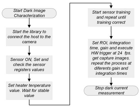 The results are displayed in the terminal console. As an example of use, Figure 12 shows a block diagram of steps to measure Dark Image Characterization. The measurement process, defined in the Python script, is a succession of commands sent by the host to be decoded by the TuMag camera. It ends when all the gains and integration times are executed. Acquired images are sent to the host as they are captured.