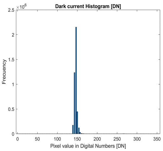 Figure 14 depicts a histogram of the image signal in non-illuminated conditions, with an exposition time of 600 ms, and under vacuum and temperature-controlled conditions (25 °C). The mean value (149 DN) represents the dark current; it represents a constant offset of the image signal.