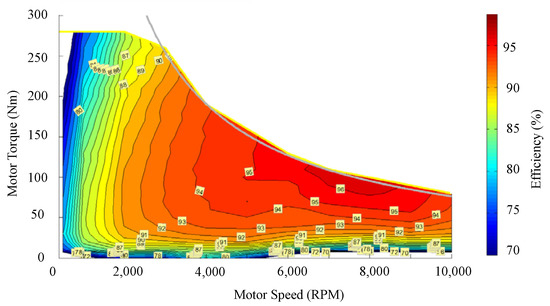 Figure 5. The energy efficiency map for the combined powertrain system of Nissan Leaf EV. The rated power for this powertrain is around 80 KW with a maximum torque of 280 NM. The image is from [92].