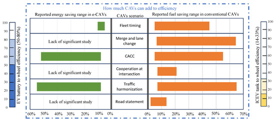 Figure 6. Comparison of conventional CAVs’ and E-CAVs’ fuel saving potentials in each scenario (results from significant studies), considering the fact that the tank-to-wheel efficiency of ICEVs is between 14% and 33%, while the tank-to-wheel efficiency of EVs is between 50% and 80% [104].