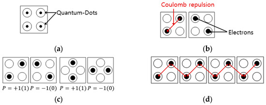 One QCA cell is composed of four quantum dots in a square pattern. In addition, the QCA cell state can be divided into a null state in which electrons are not activated, as shown in Figure 1a, and a polarized state in which two electrons in each cell are activated, as shown in Figure 1b [1]. The two electrons have a repulsive force that pushes each other, and this is called Coulomb repulsion. Therefore, as shown in Figure 1c, two states are possible, and cell polarization P = +1 or −1 in standard cells and 45° rotated cells represents “1” or “0” in binary logic [2]. QCA wiring can be made most simply by attaching cells next to QCA cells in order.