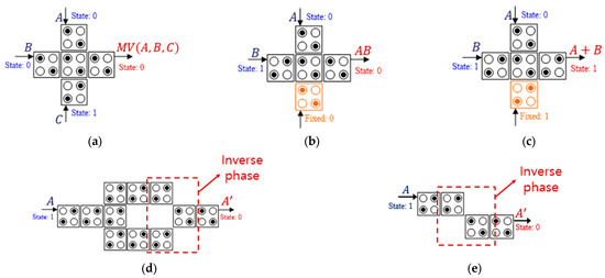 Figure 2a shows a majority vote (MV) gate to represent a logic gate. The logic function of the MV gate is achieved by Equation (1). Therefore, as shown in Figure 2b or Figure 2c, when the input value of C becomes 0 or 1, the MV gates perform AB or A + B operations. Therefore, it can be used as an AND or OR gate. Figure 2d,e show a strong and weak inverter, respectively. In the inverse phase, each state value is changed to the opposite value by the Coulomb repulsive force. Since the output value of a strong inverter is changed by the Coulomb repulsive force of two cells, the signal strength is stronger than that of a weak inverter that is changed by one cell, and the value is transmitted stably [5,6,7].