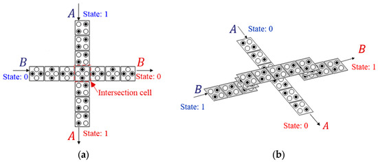 The QCA circuit is classified into a coplanar structure composed of only one layer and a multi-layer structure using several layers [19]. Unlike the coplanar structure, the multi-layer structure has a high design complexity because the circuit is designed considering the interaction between the layers. Figure 4a shows the wire crossover of the coplanar structure. Normal cells and cells rotated by 45° do not affect each other’s values when crossing, so they can be used for plane crossing. Figure 4b is a wire crossover of a multi-layer structure using three layers and shows that the value of the other layer is not affected when there is a difference between two or more layers [33,35].