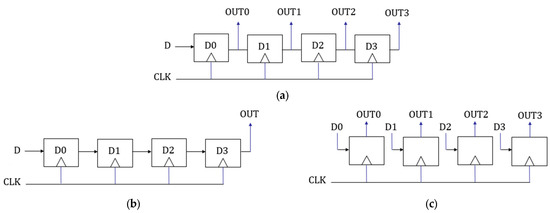 Figure 7 shows various typical SISO SRs. In 2015, Reshi et al. introduced three types of SR [29], and in 2017, Das et al. proposed a 3-bit SR under thermal randomness [34]. In 2018, Divshali et al. proposed a multi-layered SR consisting of three different D flip-flops and five layers [35], and Kalyan et al. proposed a 4-bit SR using a JK flip-flop [36]. In 2019, Abdullah-Al-Shaf et al. proposed a SIPO-type SISO SR with a RAM structure [37], and Li et al. proposed a SISO SR with PIPO [38].