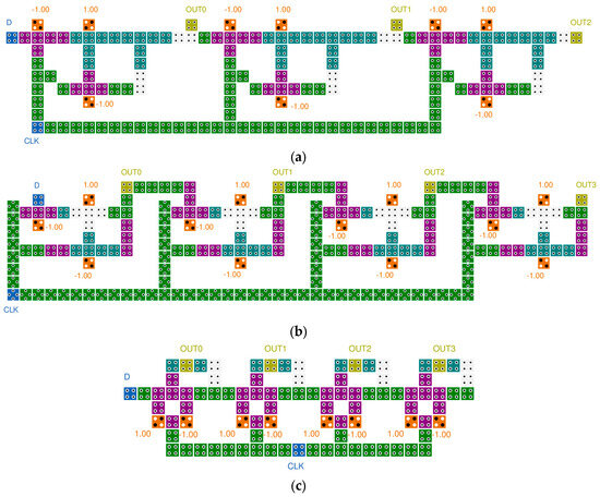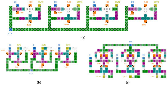 QCA PIPO shift registers: (a) Reshi et al. [29]; (b) Li et al. [38]; (c) Fan et al. [32].