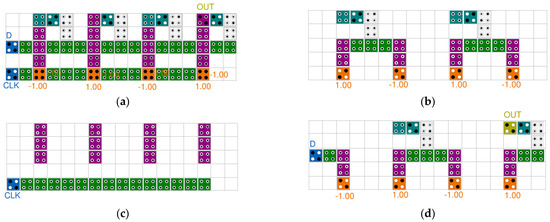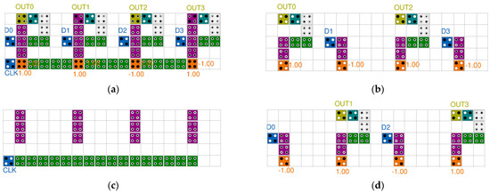Figure 11 shows the simulation results of the proposed SISO and PIPO SRs. As shown in Figure 11a, it was confirmed that the result outputs a stable value with the input value as it is after 3.75 clock cycles. Figure 11b confirms that the input values from D0 to D3 designated through the vector table are output normally after 0.75 clock cycles. It can be seen that the proposed structures have a very stable signal of −9.86× 10−1 J ≤ OUT ≤ 9.87× 10−1 J.
