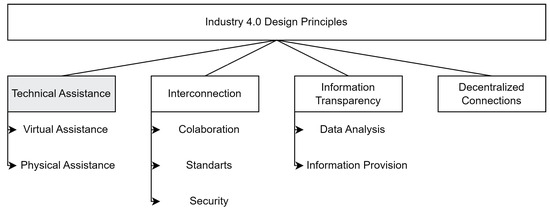 Despite its widespread adoption, there is no unified and universally accepted definition of the “Industry 4.0” concept in the literature. In this perspective, the I4.0 Design Principles, which can be defined as Interconnection, Information Transparency, Decentralization of Decisions, and Technical Assistance, based on [3], represent the possibility to systematize knowledge and support professionals in developing appropriate solutions [4,5]. The Technical Assistance principle considers that, in I4.0 intelligent factories, through Virtual and Physical Assistance, the role of design centered on the human operator [6] is to perform functions with higher added value, enabling strategic decision-making and problem-solving with flexibility [3,7].