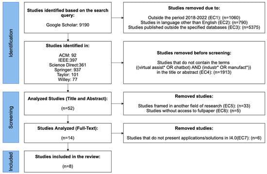 - Exclusion Criterion 4 (EC4): studies that do not have the terms “Virtual Assist*”, or “chatbot” and “industr*”, or “manufact*” in the title or abstract. In search queries, the “*” symbol functions as a wildcard character. It represents any combination of characters or words that may follow a specific prefix.
